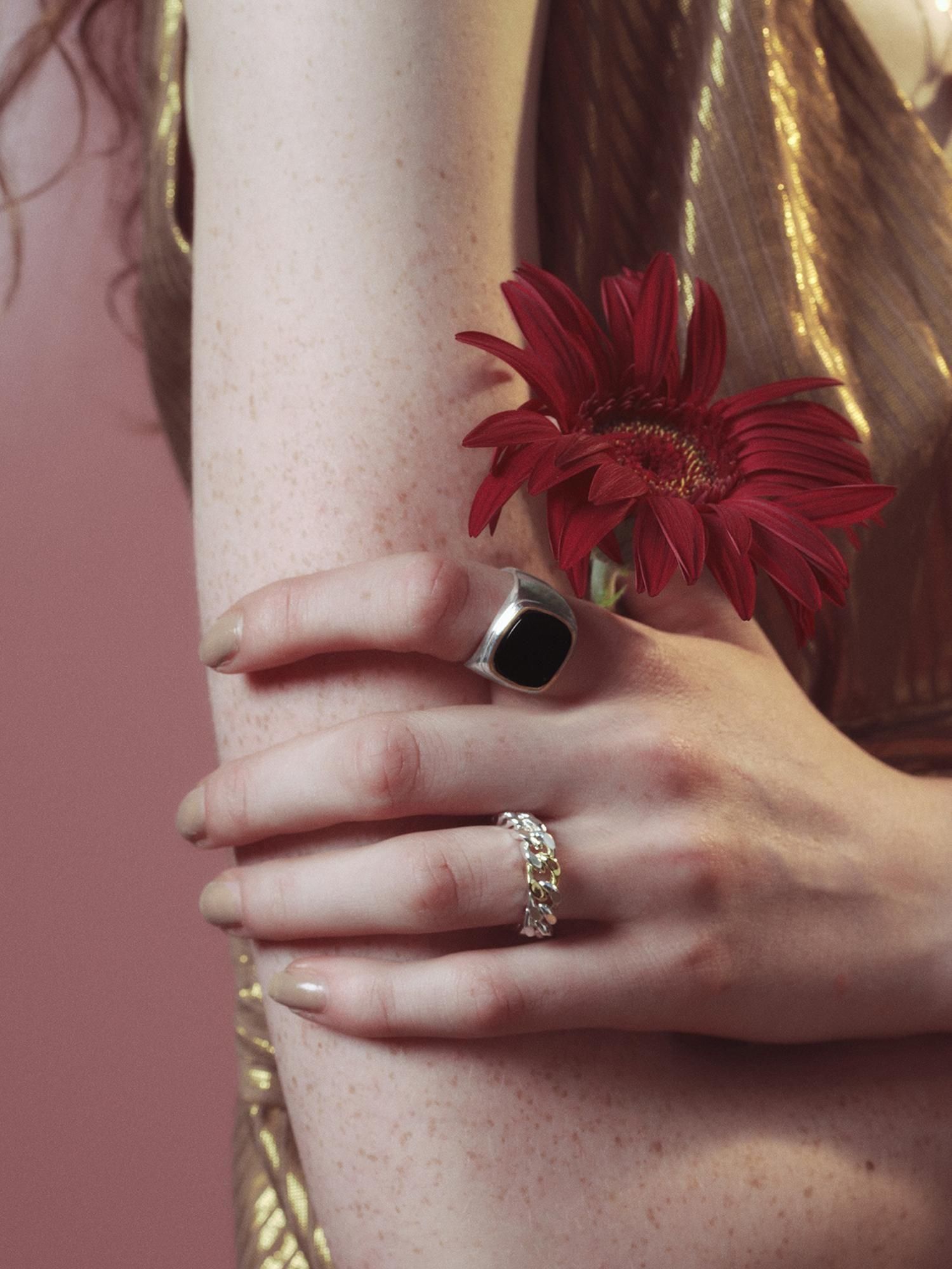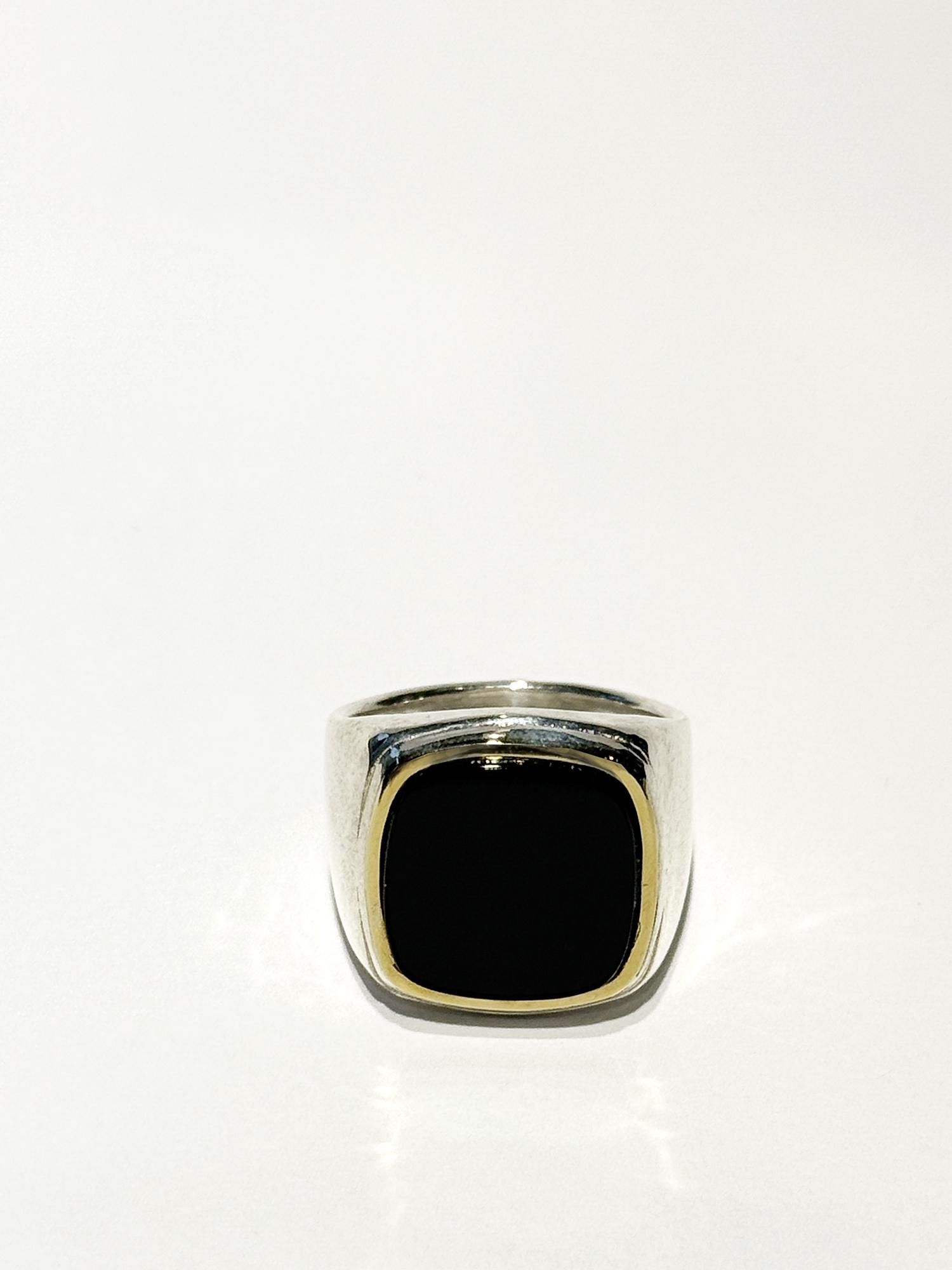 金はHELIOS(太陽)の輝き、銀はARTEMIS(月)の輝き。K18の地金で囲ったオニキスのスクエアフォルムを際立たせる為、腕を垂直に削ぎ落としたデザインが美しいリング。オニキスは古代から魔除けの石として、重用されてきました。